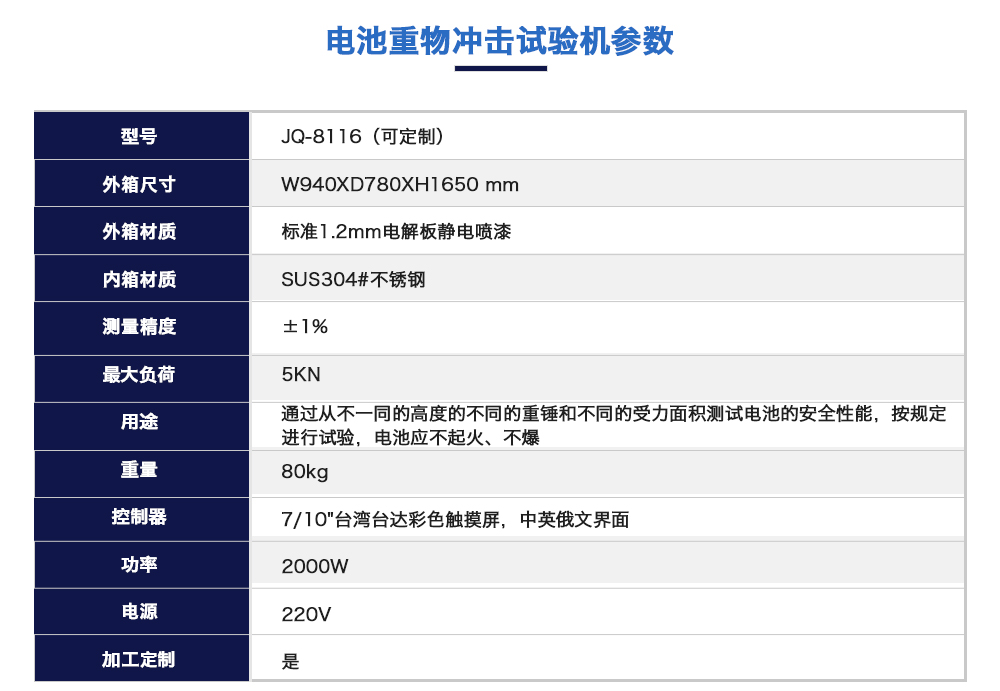 用途:電池重物沖擊試驗機是模擬通過從不一同的高度的不同的重錘和不同的受力面積測試電池的安全性能,按規定進行試驗,電池應不起火、不爆炸。也是各電池廠家及研究所必不可少的檢