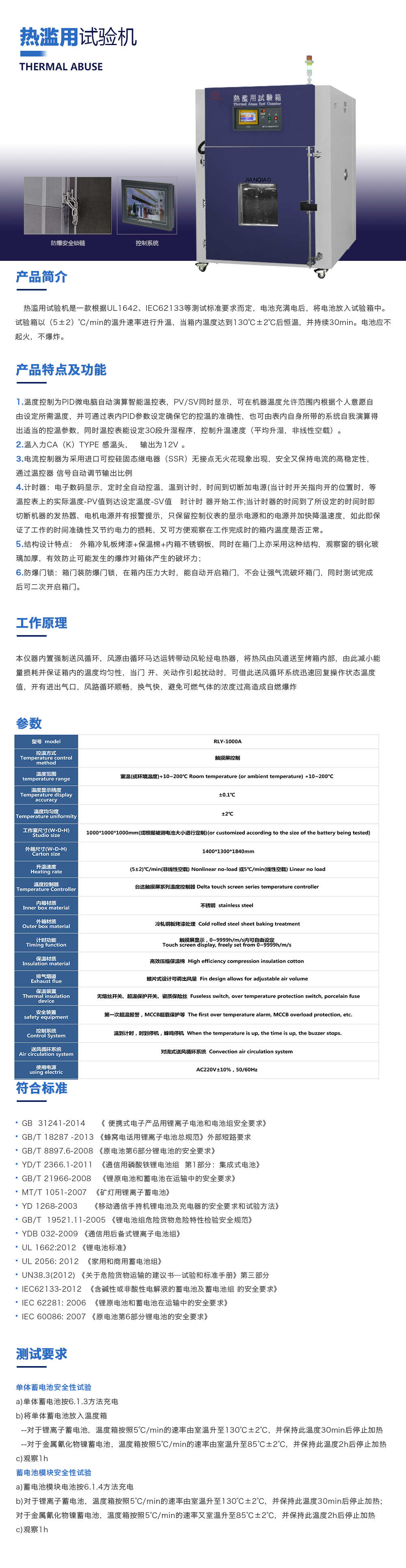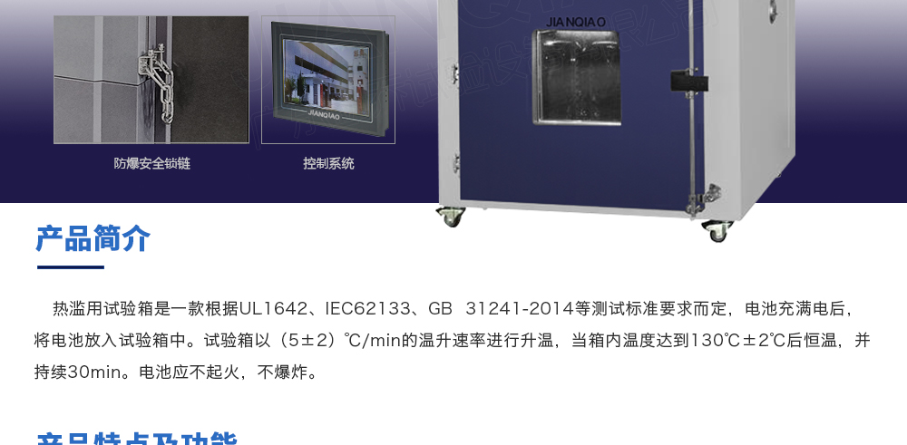 產(chǎn)品型號(hào):JQ-101-512A 品牌:劍 喬 用途:熱濫用試驗(yàn)箱是一款根據(jù)UL1642、IEC62133等測試標(biāo)準(zhǔn)要求而定,電池充滿電后,將電池放入試驗(yàn)箱中。試驗(yàn)箱以(5±2)℃/min的溫升速率進(jìn)行升溫,當(dāng)箱內(nèi)溫度達(dá)到130℃±2℃后恒溫,并持續(xù)咨詢熱線:13829135130