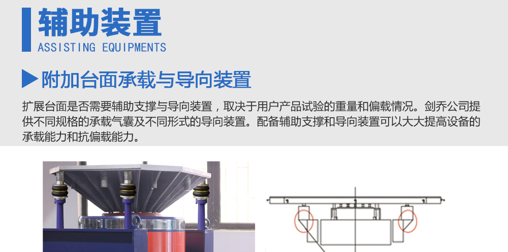 用途:擴展臺面是否需要輔助支撐與導向裝置,取決于用戶產品試驗的重量和偏載情況。劍喬公司提供不同規格的承載氣囊及不同形式的導向裝置。配備輔助支撐和導向裝置可以大大提高設備的承載能